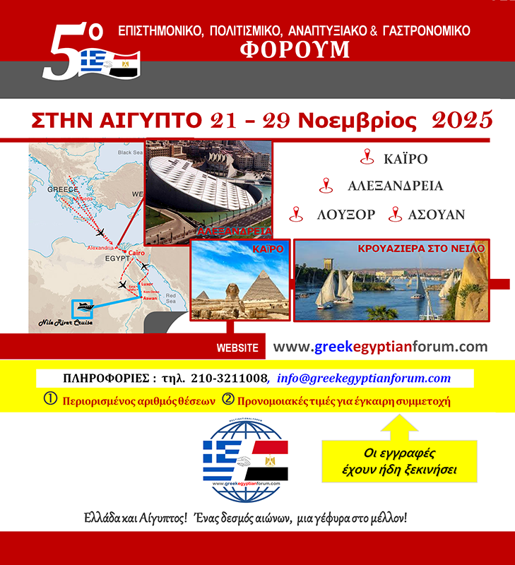 5ο Φόρουμ Ελληνοαιγυπτιακής Φιλίας – Αίγυπτος 13–20 Νοεμβρίου 2025 – Ένα υψηλού επιπέδου θεσμικό και πολιτιστικό forum, με συμμετοχή Ελλήνων και Αιγυπτίων ακαδημαϊκών, φορέων, επιχειρηματιών και καλλιτεχνών, που στόχο έχει την προώθηση της στρατηγικής σχέσης των δύο λαών.