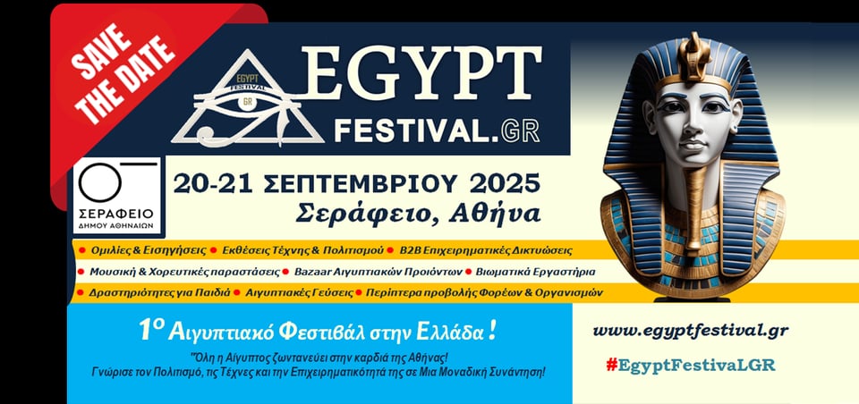 1ο Egypt Festival – Αθήνα 20–21 Σεπτεμβρίου 2025 – Μια μεγάλη πολιτιστική γιορτή με άρωμα Αιγύπτου και καρδιά ελληνική. Παραδοσιακή μουσική, χοροί, γαστρονομία, εκθέσεις και βιωματικά εργαστήρια συνθέτουν ένα σκηνικό διαπολιτισμικής συνάντησης.
