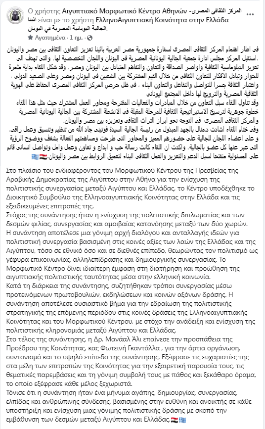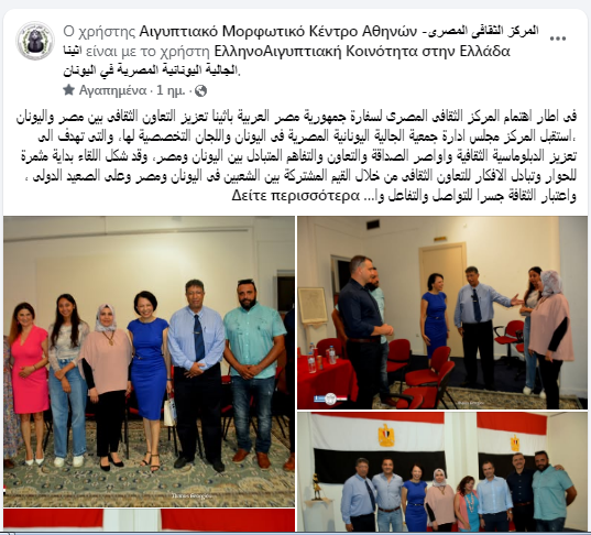 Με αίσθημα ευθύνης και πίστη στο κοινό όραμα, η Ελληνοαιγυπτιακή Κοινότητα στην Ελλάδα ανανεώνει τη δέσμευσή της για σταθερή, θεσμικά οργανωμένη και δημιουργική συνεργασία με το Αιγυπτιακό Μορφωτικό Κέντρο, με επίκεντρο τον πολιτισμό, τη γνώση και τη γλώσσα ως γέφυρες φιλίας και διαπολιτισμικής συνύπαρξης.