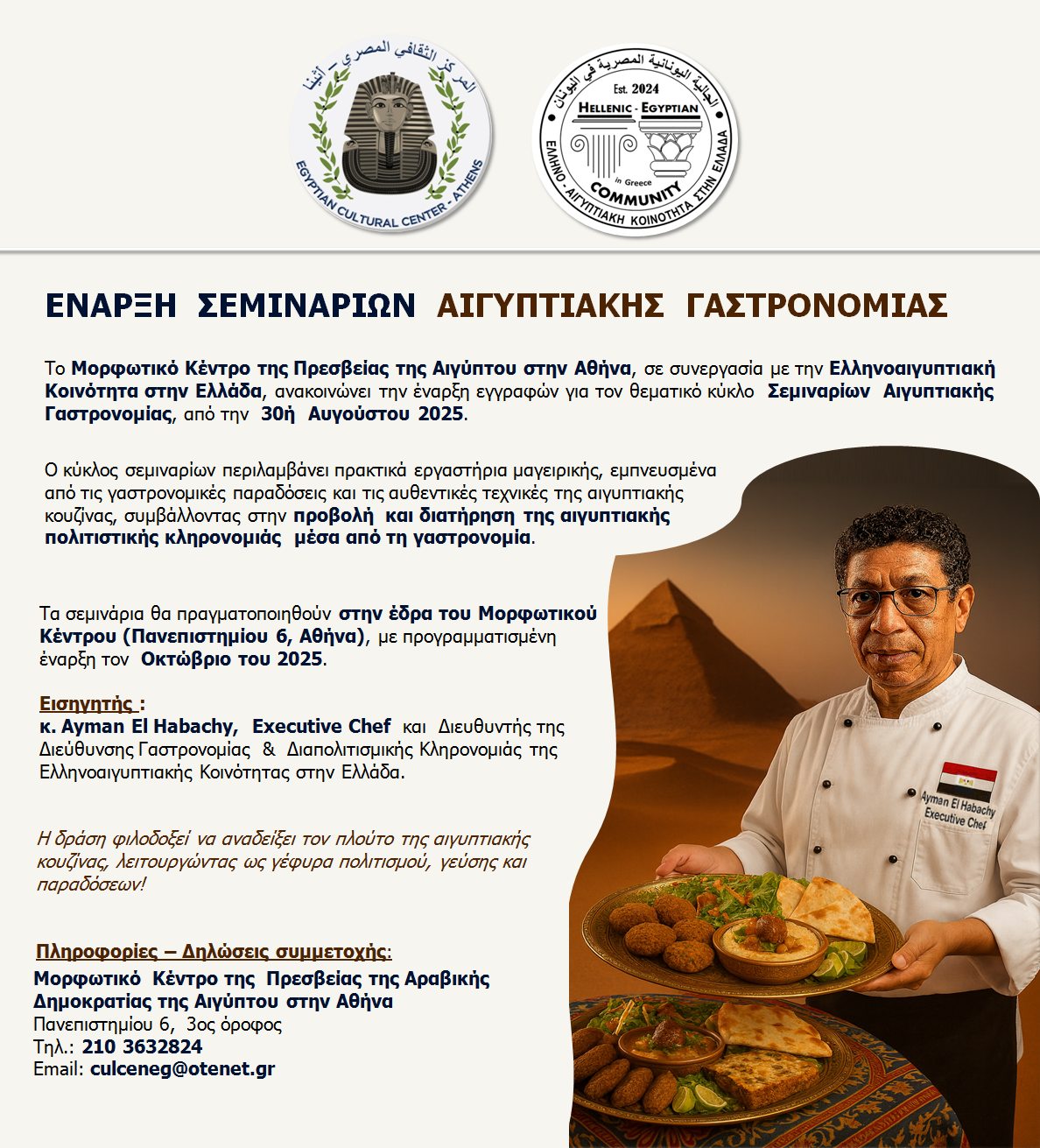 Ξεκίνησαν οι εγγραφές για τα Σεμινάρια Αιγυπτιακής Μαγειρικής...Το Μορφωτικό Κέντρο της Πρεσβείας της Αιγύπτου στην Αθήνα, σε συνεργασία με την Ελληνοαιγυπτιακή Κοινότητα στην Ελλάδα, ανακοινώνει την έναρξη εγγραφών για τον θεματικό κύκλο Σεμιναρίων Αιγυπτιακής Γαστρονομίας, με έναρξη εγγραφών από την 30ή Αυγούστου 2025 και προγραμματισμένη έναρξη των μαθημάτων τον Οκτώβριο 2025... |